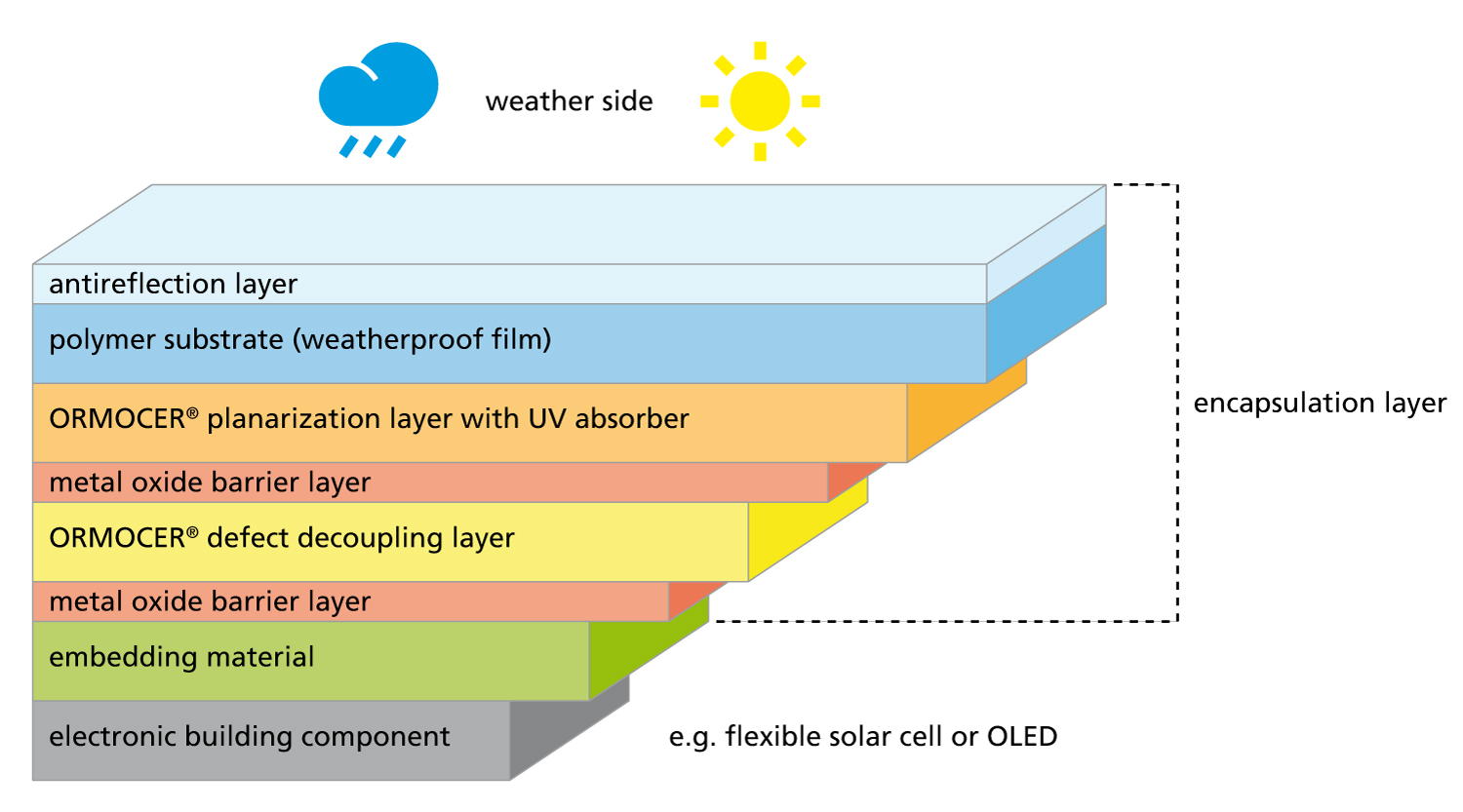The functional film is based on a multiple layer concept which includes specific hybrid polymers (ORMOCER®s) and at least one metal oxide layer (illustrated below). ORMOCER®s are a class of material developed by the Fraunhofer Institute for Silicate Research ISC. ORMOCER® lacquers are suitable for wet chemical roll-to-roll coating processes. ORMOCER® coatings smooth rough film surfaces and cover surface and coating defects. They have good gas barrier properties and they protect underlying layers and encapsulated components against degradation from UV radiation when provided with integrated UV absorbers.